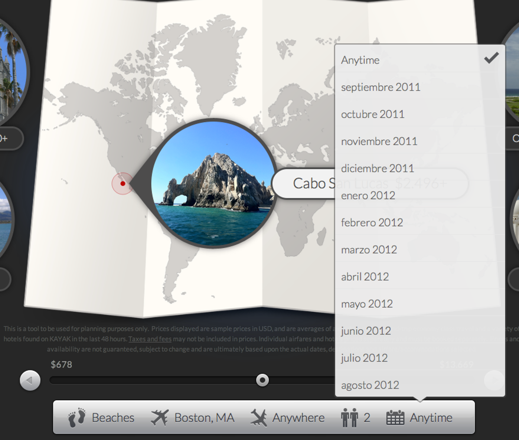 KAYAK Explore te permite encontrar buenos precios en distintos sitios del globo. Podrás filtrar por número de viajeros, temática del viaje, lugar de origen y el mes deseado.